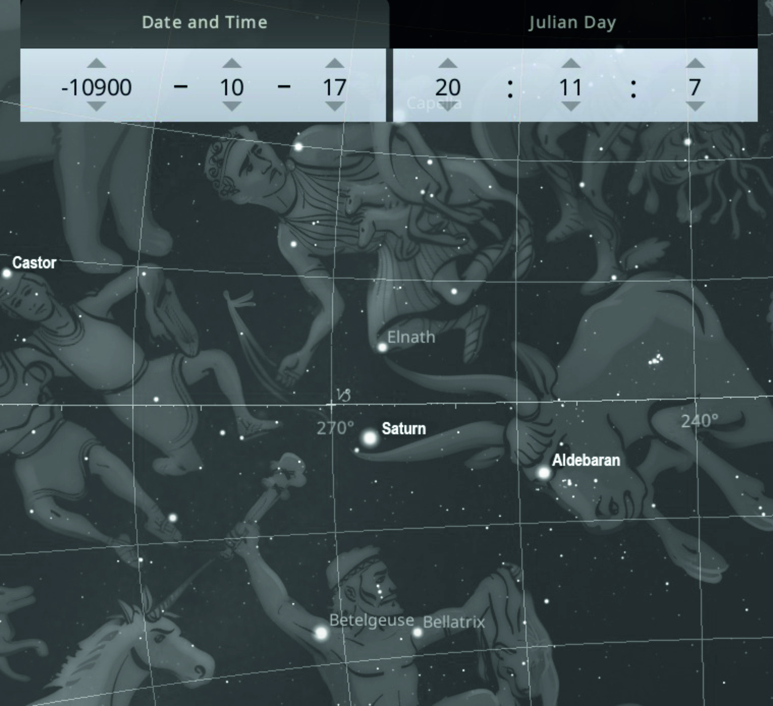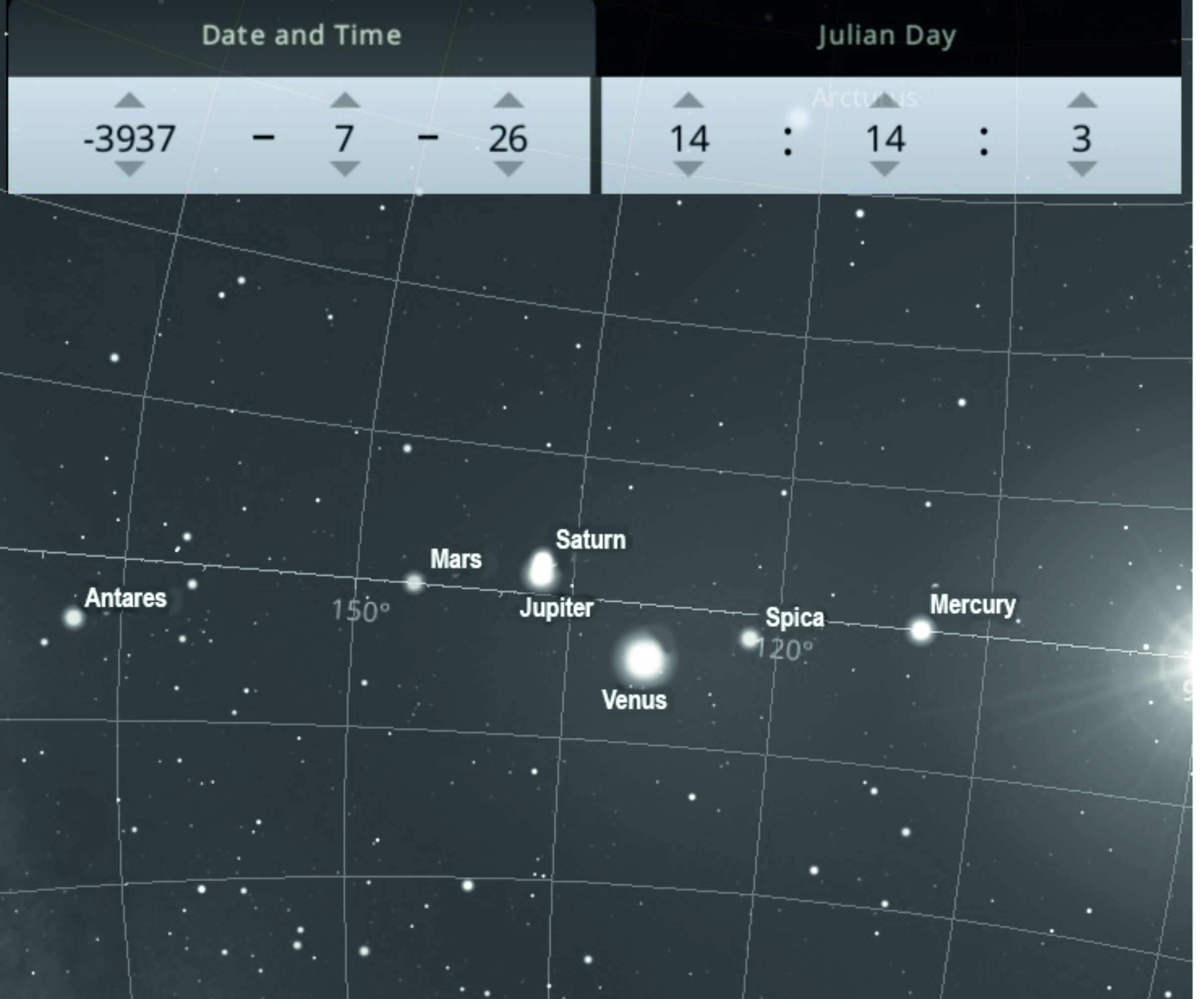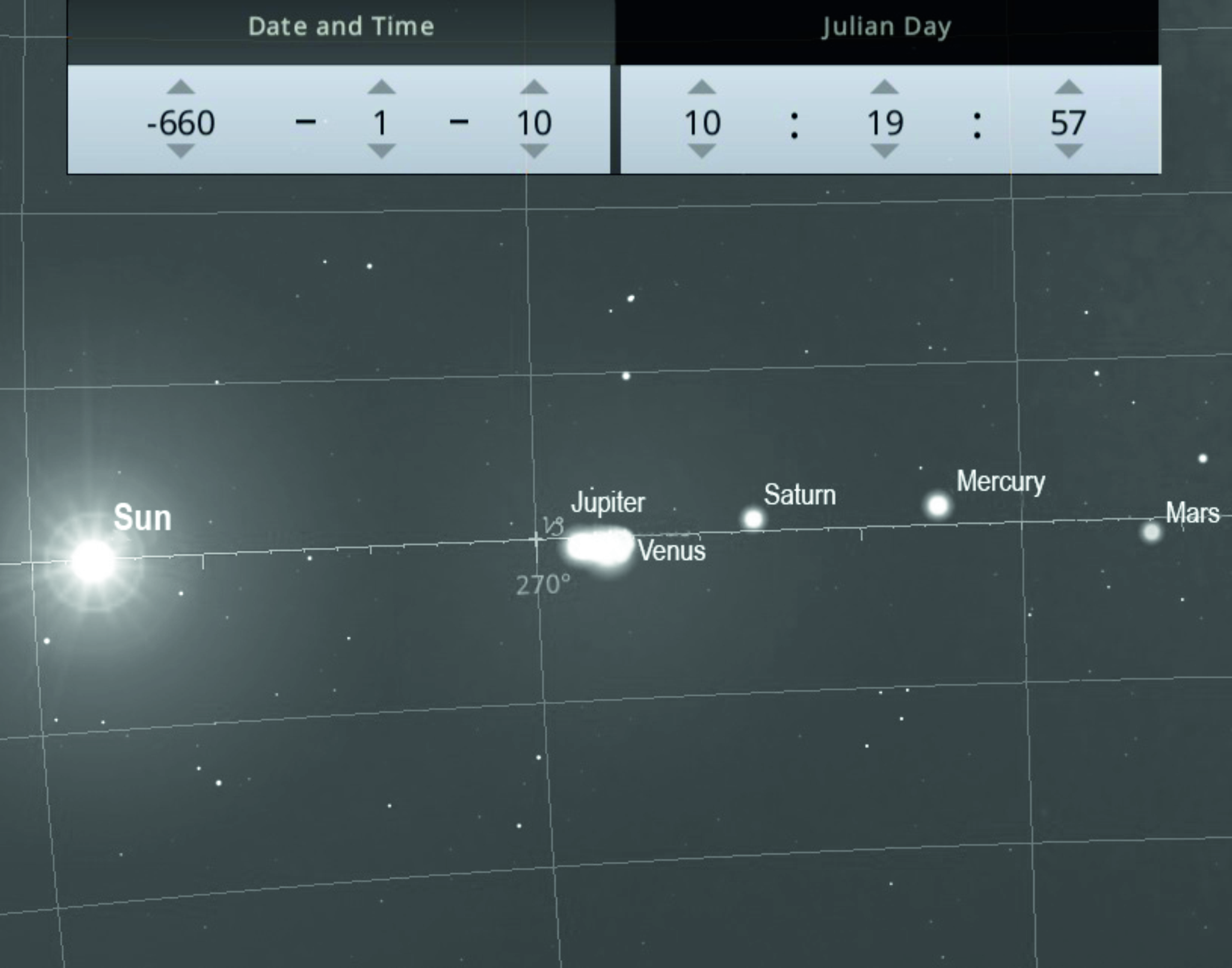 The bright light on the left marks the conjunction of Jupiter and Mercury in the night sky in the early morning on 21 January 660 BCE.