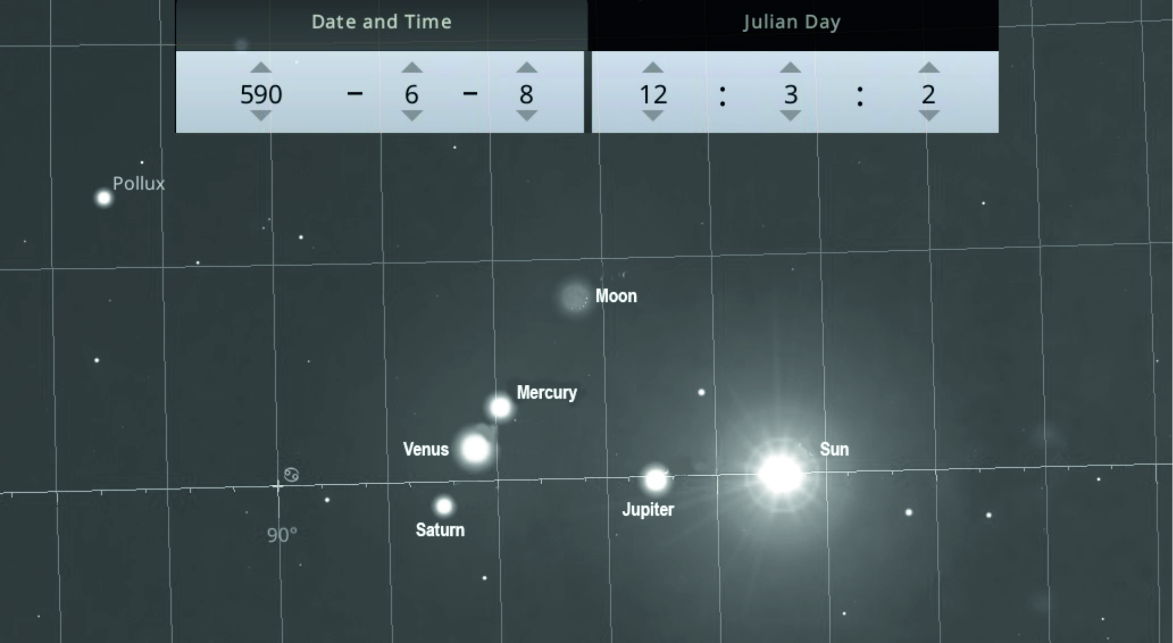 The conjunction of all the planets except Mars on 8 June 590 CE.