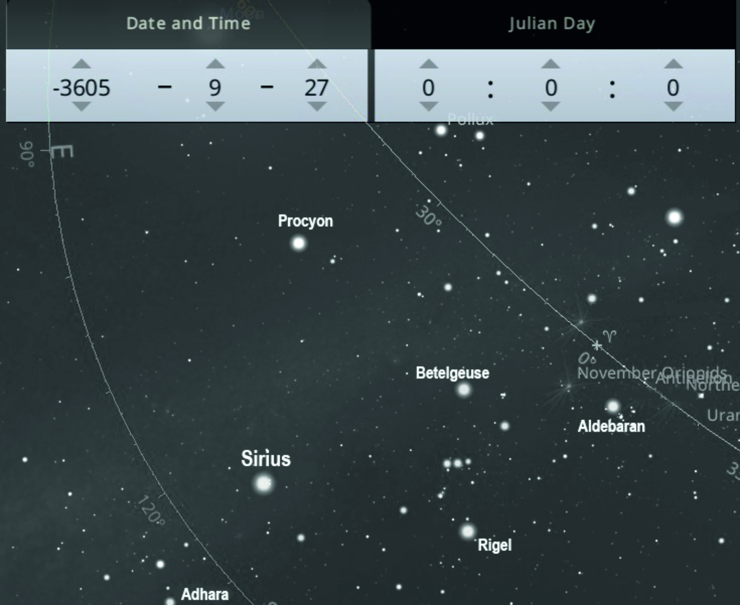 Midnight rising of Sirius star at 00:00 hours on 26 September 3605 BCEat Alexandria, Egypt.