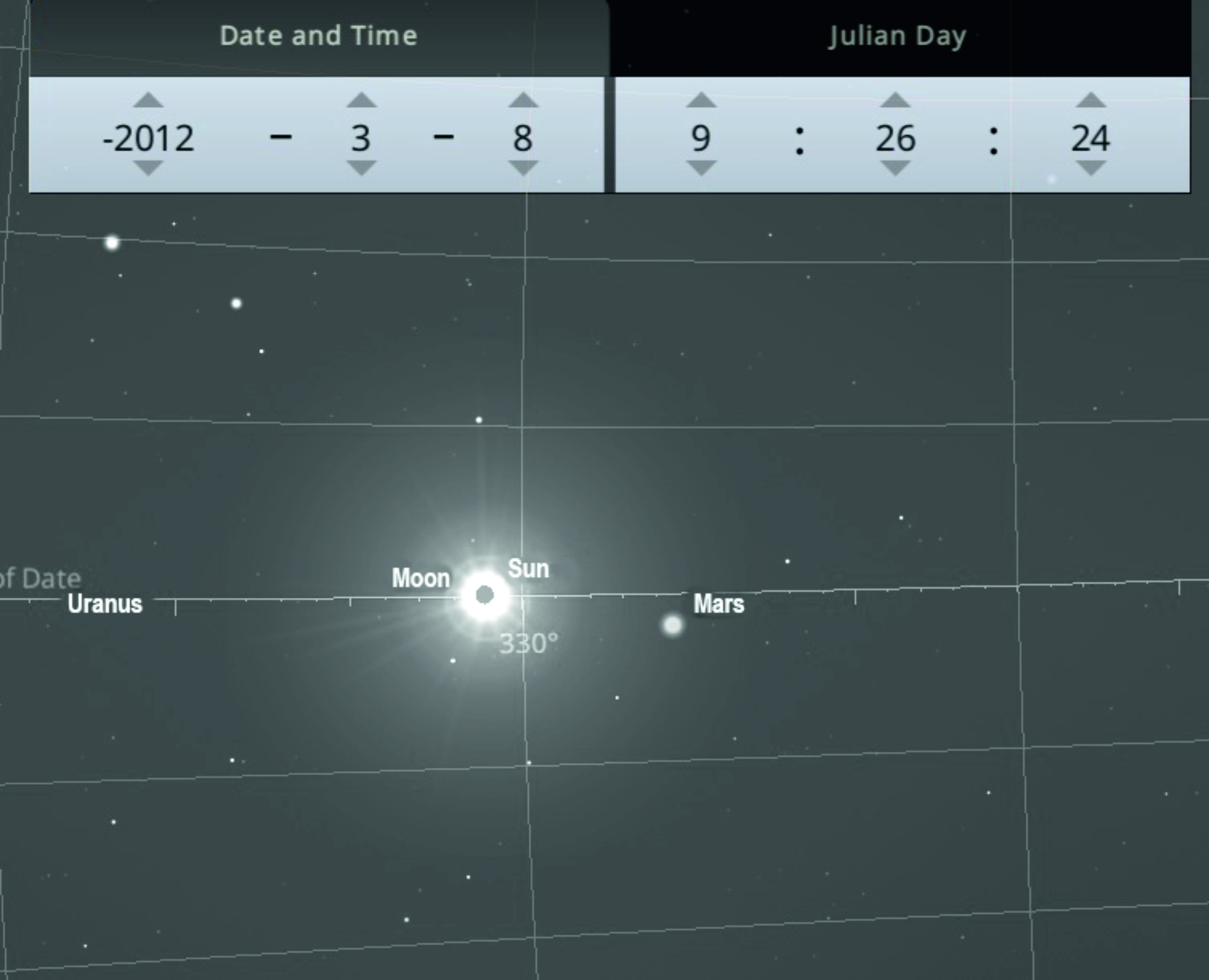 Total solar eclipse on 8 March 2012 BCE at 9 a.m. in the month of Adar(also known as Hiyar) with Mars shown to the right of the eclipse as a bright light.