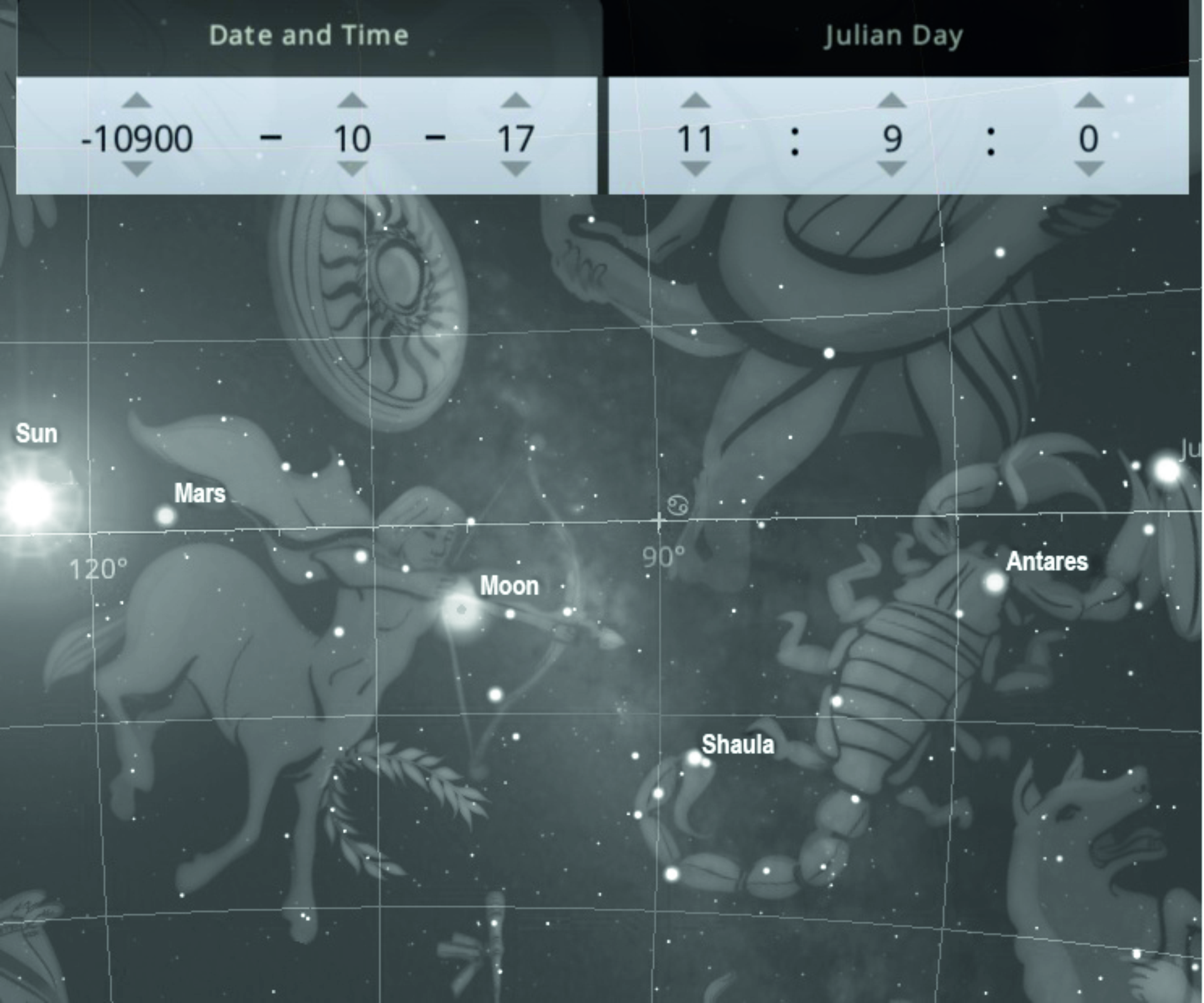Summer solstice at the first degree of Scorpio around 10900 BCE.